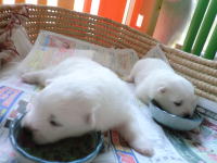 オッパイに夢中の仔犬達。ナッチーママは仔犬を整理整頓、 鼻で仔犬を誘導します。 それでも、 オッパイが探せなくて迷子になると、 今度は「ピーピー」泣いて、 ナッチーママに知らせます。 |